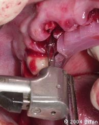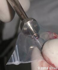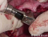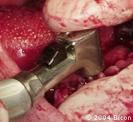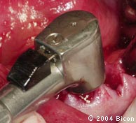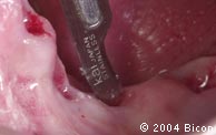 9. Расширение остеотомических отверстий выполняют захватывающей фрезой, при 50 об/мин. Пальцем свободной руки оказывают давление на наконечник в апикальном направлении.