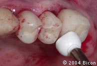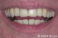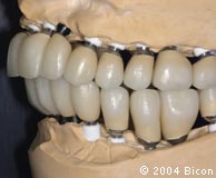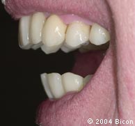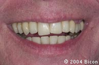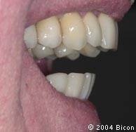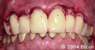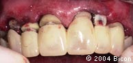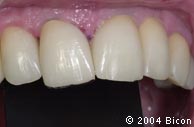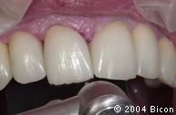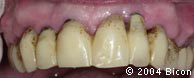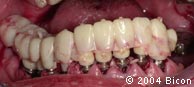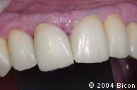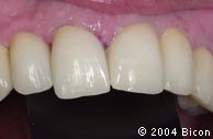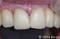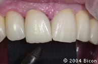 120. Вид реставраций, установленных после устранения излишков мягких тканей и кости десневым римером.