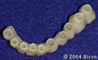 78. Вид нижней челюсти со слепочными пластиковыми абатментами.