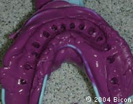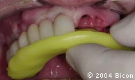79. Вокруг штифтов наносится слепочный материал, чтобы снять слепок на уровне имплантатов.