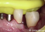 103. Желтый направляющий шаблон используется для более точного позиционирования искусственных зубов Integrated Abutment Crown™. Очень важно обнаружить и устранить любые неровности мягких тканей, кости, межзубных перегородок, которые могут помешать полной посадке коронки и срабатыванию запирательной системы абатмента и имплантата.