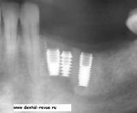 4. Рентгенограмма в области 34-35 через 2 месяца после установки имплантатов. Резорбции кости нет. Уникальный дизайн имплантатов системы Bicon позволяет компенсировать некоторые ошибки хирурга.