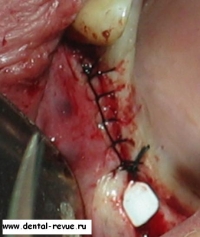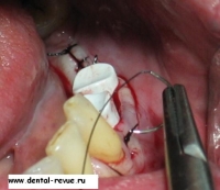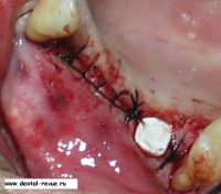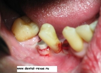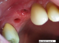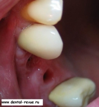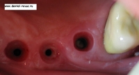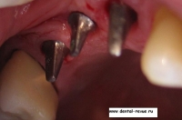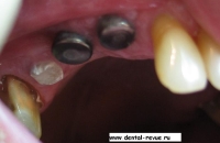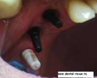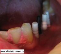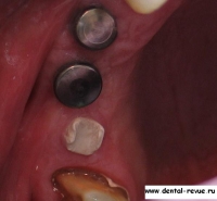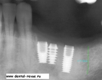 3. Зуб 34 был удален по поводу обострения хронического периодонтита, периостита за два месяца до операции. В области 34-35 имплантаты установлены слишком близко друг к другу. Такое расположение имплантатов связано с тем, что в области 34 имплантация проводилась фактически в лунку удаленного зуба — это помешало правильно сформировать ложе имплантата. Если бы подобным образом были установлены какие-либо винтовые имплантаты — это привело бы к потере обоих. Имплантат системы Bicon имеет выраженные боковые плато, между которыми прорастает кость с достаточным кровоснабжением.