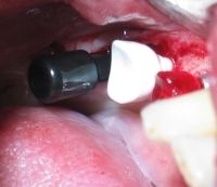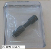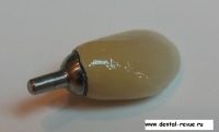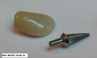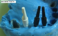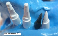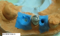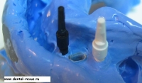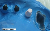 61. Специальный фиксатор для правильной установки, зацементированных на абатмент коронок в имплантаты в области передних зубов верхней челюсти (от клыка до клыка) и при резком несоответствии оси коронки и имплантата. Фиксирующий оттиск делается из жесткой массы ( в данном случае мы испльзовали базу от С-силикона — Optosil), так чтобы ось фиксатора совпадала с осью имплантата. Необходимо нанести минимум 6 мелких ударов молотком по фиксатору при установке коронки в имплантат.