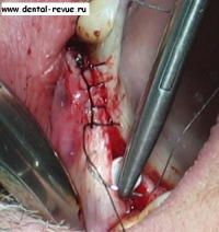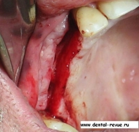 2. Под инфильтрационной анестензией удалены 13, 25, 28. Установлены имплантаты в области 15,36,35,34,44,46.Немедленная имплантация в обл. 13 и 14 была невозможна по причине наличия кистозного новообразования около 1,5 см в диаметре в обл. верхушки корня 13.