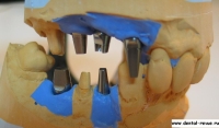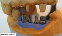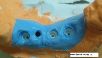31. К оттискным трансферам присоединены пластиковые аналоги имплантатов. Была отлита рабочая модель из гипса 4-го типа.