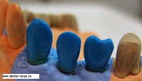 41. Абатменты были отпрепарированы (создан круговой уступ), примерены в полости рта (оценка уровня уступа, дополнительное препарирование). Из воска смоделированы каркасы будущих коронок. На фото: модель верхней челюсти справа, восковая моделировка коронок на абатментах, каркас коронки 16 покрыт опаком.