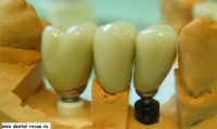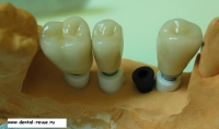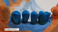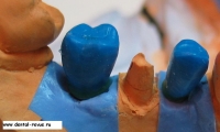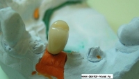 55. Металлокерамическая коронка на имплантат в области 35. Была изготовлена дополнительная модель по оттиску, полученному с оттискным тансфером в имплантате 35 и готовыми коронками на абатментах в соседних имплантатах.