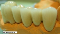 53. Вид готовой работы на модели. Металлокерамические коронки на нижней челюсти справа, вид с вестибулярной поверхности.