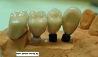 51. Вид готовой работы на модели. Металлокерамические коронки на верхней челюсти справа, вид с вестибулярной поверхности.