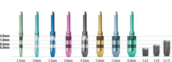 Фрезы используются последовательно, начиная с диаметром 2,5 мм и заканчивая диаметра предназначены имплантата. Развертки имеют горизонтальной разметки 6.0, 8.0, 11 и 14 мм, в то время как старший развертки могут иметь различную маркировку. Крайне важно, чтобы глубина показателей на защелку развертки известны до операции. Никаких предположений должно быть сделано о высоте первого маркировка на той или иной фрезы. Если есть какие-либо сомнения по поводу маркировки бор или развертки, сделать измерение перед использованием расширителя.